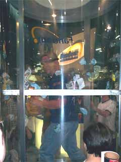 | As soon as we entered the show floor we noticed a guy inside a clear tube at the Fandom booth trying to grab as much cash and Wizard dollars as he could.