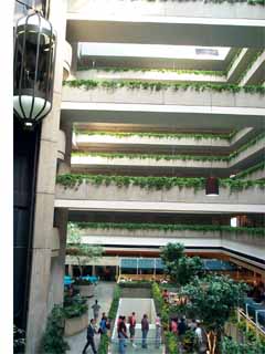 Heres another view of the hotel. You can see the exposed elevators in the center column and each of the floors. All of the plants lining the walkways appeared to be real. It was quite nice. | |